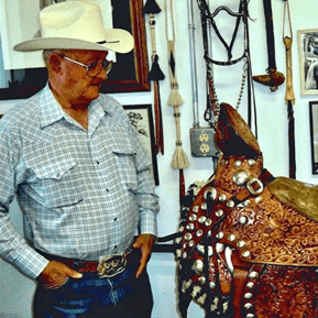 Billy Cook opened his first saddle shop in Greenville, TX in 1953. He built 75 saddles in his first year. As his business grew over the next few years he partnered with Potts-Longhorn and production was scaled to 1,200 saddles a year by the end of the 50s and it became known as Billy Cook Saddlery/Potts Longhorn. Billy Cook’s saddles were meticulously hand tooled on sturdy saddle trees and were some of the best production saddles of that time period, gaining international recognition. Billy was the manager of this operation for many years, designing all the saddles, making patterns and then having a complete set of dies made for every new design. He later opened another shop in downtown Greenville making harnesses, called Billy Cook Harness. Eventually he started making saddles there as well. He would work at Longhorn in the morning and go to the harness shop in the afternoon.